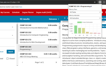 Além de exibir a distribuição de notas, Madgrades+ oferece recursos adicionais, como a filtragem das informações por semestre e instrutor, proporcionando uma análise mais aprofundada das opções disponíveis. Essa funcionalidade é especialmente útil para estudantes que desejam otimizar suas escolhas de cursos e entender melhor o histórico de desempenho em diferentes disciplinas.
